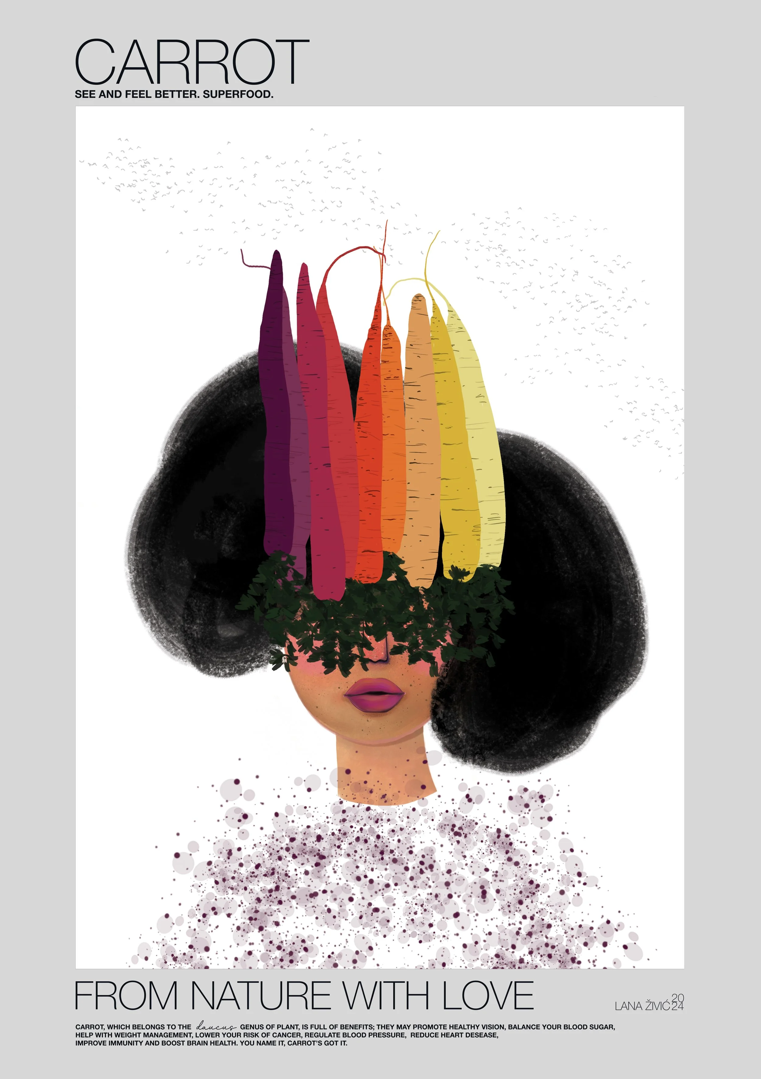 Each ingredient was transformed into a "nutritive hero," dressed in vibrant wardrobes made from carefully chosen fruits and vegetables. The artworks blended playful imagination with the richness of nature, turning everyday ingredients into powerful, character-like figures.